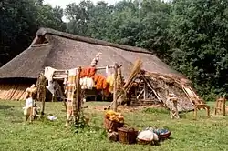 Das mit Reet gedeckte Walmdach ragt weit über die Wände hinaus, damit die zur Imprägnierung unten angebrannten Eichenpfosten und die Lehmwände nicht nass werden und damit länger halten.