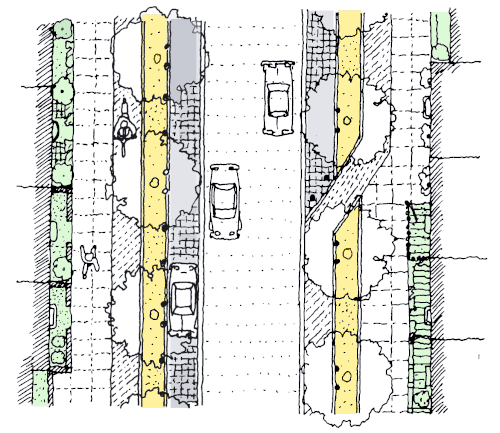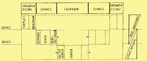 Freiräume stehen häufig in einem funktionalen Bezug zu Gebäuden und umfassen deren Zugänge, Höfe, Gärten und Stellplätze.[8] Diese Zuordnungen und funktionalen Bezüge werden in Freiraumtypologien dargestellt zum Beispiel Formen von Haus und Hof; Zuordnungen von Haus, Vorgarten und Straße; Zonierungen von Gehweg, Bordstein, Parkstreifen und Fahrweg.[9] Die Freiraumfunktionen weisen eine bauliche und eine soziale Seite auf. Beispielsweise legt sich über das Material, aus dem eine Straße gebaut wird, und ihre Zonierung ein Geflecht sozialer Beziehungen, das die Nutzer in Gesprächen und Handlungen herstellen.[10] Insofern sind Freiräume von der Verfügbarkeit, Nutzbarkeit und Interpretierbarkeit abhängig.[11] Entsprechend ihrer Funktionsbindung werden dysfunktionale Freiräume von funktionalen Freiräumen unterschieden, wobei die Funktionsbindung von vielfältig nutzbaren bis zu funktional festgeschriebenen Einrichtungen (Funktionalisierung) reicht.[12] Stark funktionalisierte Einrichtungen werden nicht mehr als Freiraum bezeichnet, weil sie nicht frei nutzbar bzw. interpretierbar sind.
