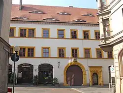 Das repräsentative Gebäude des ehemaligen adeligen Fräuleinstifts gehört zu den Denkmalen der Renaissance in der Altstadt von Halle.[23] Die fensterreiche Fassade des ehemaligen Stiftsgebäudes in der Rathausstraße wird durch eine großzügige Toreinfahrt und ein Fußgängerportal aus der Zeit der Renaissance aufgelockert. Die steinerne Umrahmung des Tores ist mit Diamantquadern geschmückt, die durch einen gelben Anstrich betont sind. Die Toreinfahrt führte einst in den ruhigen, erholsamen Hof, der von einem Ost- und einem Westflügel umschlossen wurde. Ein künstlicher Springbrunnen[24] befand sich zur Erholung der Stiftsdamen reformierten Bekenntnisses und der sie geistlich betreuenden Domprediger sowie der Kuratoren auf dem Hofgelände, zu dem Bäume und ein Garten gehörten.