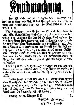 - Titelseite der Erstausgabe der Liechtensteinischen Volkswirtschaftlichen Zeitung 12. September 1931 (PDF; 1,1 MB)