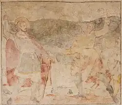 | 24 | Südwand unten, rechts aussen | Ein Pilger betet vor dem Wolfgangsbild, das an einem Baum hängt | Ein Hinweis auf die Gründungsgeschichte der Kirche (eine von vier) |