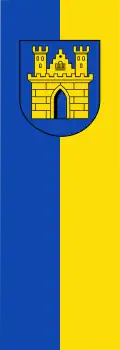 Blasonierung: „In Blau ein goldenes (gelbes) Stadttor, über dessen Zinnenmauer mit offenem spitzbogigen Tor befindet sich ein Staffelgiebel, flankiert von zwei Zinnentürmen.“[22] |