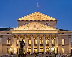 Auch nach der Wiedereröffnung blieben die „Freunde des Nationaltheaters“ dem Haus eng verbunden. Sie sammelten weiter für das Gebäude, etwa für die Finanzierung des steinernen Giebelfeldschmucks am Portikus. Dieser Giebelfeldschmuck „Apoll und die neun Musen“ wurde von Georg Brenninger geschaffen und 1972 enthüllt. Als 1993 der Bühnenhauptvorhang während einer Probe Feuer fing und verbrannte, übernahmen die „Freunde des Nationaltheaters“ die Kosten für eine Neubeschaffung. Gemeinsam mit der Bayerischen Handelsbank AG wurden die nötigen 450.000 D-Mark aufgebracht. Der rote Raffvorhang mit 120 jeweils meterlangen Goldquasten und sechs goldenen Lorbeerkränzen im Durchmesser von zwei Metern konnte so bereits in der Spielzeit 1995/96 wieder hochgezogen werden.[16] Anlässlich des 200-jährigen Bestehens der Musikalischen Akademie des Bayerischen Staatsorchesters und des 60-jährigen Jubiläums der „Freunde des Nationaltheaters“ stiftete der Verein 2011 einen neuen Steinway D Konzertflügel. Die Anschaffungssumme von 120.000 Euro brachte eine Spendenaktion unter den fördernden Mitgliedern ein. Da die Fassade des Nationaltheaters an spielfreien Tagen nur zweckdienlich beleuchtet wurde und damit ihre acht Säulen, ihre Pilaster sowie das untere und obere Tympanon nur schwer zu erkennen waren, setzten die „Freunde des Nationaltheaters“ in Zusammenarbeit mit dem Münchener Unternehmen Osram Licht AG das Haus ins richtige Licht. Am 2. November 2017 wurde die Fassadenbeleuchtung eingeweiht: Der Säulen-Portikus und die beiden Tympana des Theaters werden seitdem durch ein spezielles LED-Konzept hervorgehoben.[17] Jüngstes Projekt der „Freunde“ im Nationaltheater war die Vorstellung des neuen „Freunde Foyers“ am 19. März 2018. Die nördliche Eingangshalle wurde mit Polsterelementen, Beleuchtung und großen Fotocollagen des Foto- und Filmkünstlers Christoph Brech zu einem einladenden und repräsentativen Foyer umgestaltet.[18] In diesem Raum, gewidmet dem Bayerischen Staatsorchester, sollen in Zukunft auch Kammerkonzerte, Werkeinführungen und Veranstaltungen für Kinder stattfinden.