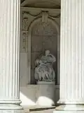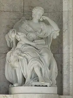 Eine Apotheose der Wilhelmine von Bayreuth bedeutet ihre Darstellung als überlebensgroße Sitzstatue in einer Rundbogennische an der rückwärtigen schmalen Wandfläche. Ihr nackter Fuß ruht auf einem vierbeinigen Schemel und lädt nach dem Vorbild antiker Götterstatuen zur Verehrung ein. Das Haupt neigt sich huldvoll dem Betrachter zu, das auf dem Schoß ruhende Buch steht als Attribut für die Beschützerin der Wissenschaften. Die Statue stammt aus der Werkstatt des Bildhauers Johann Lorenz Wilhelm Räntz.[3] Als Vorlage für die Figur aus Marmor diente ein Gemälde des Porträt- und Hofmalers Antoine Pesne.[4] Die Medaillons an den Säulenschäften mit Bildnissen von Freundschaftspaaren aus der Antike und das Buch in ihrer Hand weisen auf die Begeisterung der Markgräfin für dieses Zeitalter hin. „Die Gegenüberstellung tugendhafter männlicher Freundschaften mit Wilhelmine drückte die höchste Wertschätzung aus, die der König je einer Frau gegenüber zeigte.“[5]