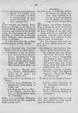 - Friede und „immerwährende Freundschaft“ zwischen den Staaten des Deutschen Reiches und Tonga (Artikel 1)