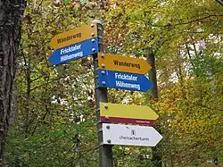 In der Landschaft des Fricktals bewegt sich der Wanderer auf geschichtsträchtigem Boden. Dies bringen auch die Wegweiser des Fricktaler Höhenweges zum Ausdruck, welche sich von den gelben Schildern der Schweizer Wanderwege SAW unterscheiden. Die blauen Schilder ziert ein Wappen, das auf weissem Grund ein grünes Lindenblatt zeigt. Es handelt sich dabei um das Hoheitszeichen des Kantons Fricktal (1802–1803), das auf die bewegte geschichtliche Vergangenheit der Grenzregion zwischen Jura und Rhein hinweisen soll.