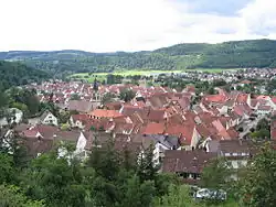 Wappenbegründung: Das zuletzt am 19. Juni 1963 vom Innenministerium verliehene Wappen ist abgeleitet von einem seit dem frühen 16. Jahrhundert nachweisbaren Stadtsiegel der Grafen von Hohenberg. Das erstmals 1938 verliehene Wappen mit rotem Schildhaupt und einem von Rot und Silber gerauteten Feld, wurde 1963 in die heutige Form geändert.
