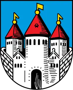 Blasonierung: „In Blau eine wachsende silberne Torburg mit zentralem Rundturm, darin ein schwarzes Rundportal, flankiert von zwei giebelbedachten silbernen Wichhäuschen, und angesetzter schwarzgefugter Quadermauer, begleitet von zwei halbzugewandten wachsenden silbernen Türmen innerhalb der Mauer, alle drei schwarzbefenstert, rotbedacht, goldbeknauft und mit einer linkswehenden goldenen Wetterfahne besteckt.“ |