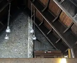 Ein Zugang zur Kirche erfolgt durch das Hauptportal im Süden. Über einen kleinen Vorraum und Treppen gelangt man in das Kirchenschiff. Es dominiert die Notkirchenkonstruktion aus dunklem Holz. Die holzsichtigen Wandpfeilerpaare bilden das Holzbinder-Tragwerk, das sich nach oben verbreitert und in das Dachgebälke übergeht, das sich zum First hin wieder verjüngt.