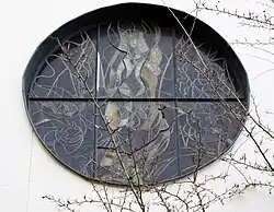 - „Ein schmales Langfenster neben der Kanzel, ein kreisrundes Fenster in der Stirnwand über dem Altar, das Eine der Gekreuzigte – der übrigens sein Haupt der Gemeinde zuneigt – das Andere der Erhöhte und Verherrlichte, so dass die beiden Fenster zusammengenommen das Christenbekenntnis der Kirche ergeben: ‚Er ward gehorsam bis zum Tode, ja zum Tode am Kreuz. Darum hat ihn auch Gott erhöht und hat ihm den Namen gegeben, der über allen Namen ist‘“[14]