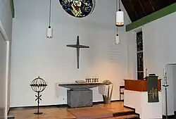 Der Innenraum ist weiß verputzt und vor allem durch das hohe, offene, in dunklem Braun kontrastierende Dach geprägt. Diese hölzerne Satteldecke ruht seitlich auf einem Rahmenbalken, während die Verstrebungen frei durch den Raum greifen. Im Westen befindet sich eine eingezogene Empore, über der die Orgel angebracht ist. Der Altarbereich ist durch einen zweistufigen Aufgang leicht erhöht. Ein Chor im strengen Sinne existiert nicht, aber durch die eingeschossige Raumflanke des Eingangsbereichs, die nur bis zum Altarbereich geführt wird, und das schmale farbige Seitenfenster entsteht allerdings ein abgesetzter Bereich mit Chorcharakter. Optisch betont wird der Altarbereich zudem durch ein großes farbiges Rundfenster oberhalb des Altars.[12] Ein wiederkehrendes ikonografisches Symbol des Altarbereichs ist das Dreieck. Es ist durch den dreieckigen Giebel, die dreieckige Gesamtheit aus Kreuz und Altarplatte, sowie eine Dreiecksgravur im Altarsockel dreifach vorhanden und symbolisiert die Dreifaltigkeit.[13]