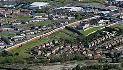 Während des Nordirlandkonflikts nahm die Segregation in den nordirischen Städten weiter zu. In Belfast waren zwischen 1969 und 1973 schätzungsweise 60.000 Menschen gezwungen, ihre Wohnungen nach Bombenanschlägen, Schießereien, Unruhen oder auf Grund von Einschüchterungen zu verlassen.[1] Insbesondere Katholiken flohen aus den bislang gemeinsam mit Protestanten bewohnten Gebieten Belfasts in Gebiete mit einer katholischen Mehrheit. Die als Provisorium gedachte Friedenslinie blieb bestehen; die anfänglichen Stacheldrahthindernisse wurden durch dauerhafte Bauwerke ersetzt. Zudem wurden weitere Friedenslinien insbesondere im Norden und Westen von Belfast, aber auch in weiteren Städten wie Derry und Portadown errichtet. Dabei wurden Wellblechzäune, Stahlwände und Mauern erbaut, später auch den Örtlichkeiten angepasste Gitter oder mehrfarbige Wände. An Straßen entstanden Tore, die dauerhaft, nur nachts oder während Unruhen geschlossen sind.[4] Einzelne Friedenslinien sind zum Teil mehrere Kilometer lang[5] und bis zu acht Meter hoch. 2010 wurde die Gesamtlänge der Friedenslinien für Belfast mit 21 Kilometern angegeben.[6]