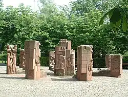 Die acht Stelen an den Ecken des Oktogons entsprechen den acht Stadtteilen, die sich um eine Steinplastik in der Mitte gruppieren, auf welcher an die zentralen Stadtteile Nord, Mitte und Süd erinnert wird. Außerdem wird das Zentrum durch kleine Wasserläufe mit den Außenbezirken verbunden.