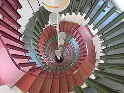Die heutige Friedenswarte hat eine Höhe von 32,5 m und besteht im Kern aus einem runden Beton-Turmschaft mit einem Außendurchmesser von 4,8 m,[2] der die Treppenanlage beherbergt. Für Auf- und Abstieg bestehen im Inneren zwei in Form einer Doppelhelix angeordnete separate Wendeltreppen mit jeweils 180 Stufen. Der Aufgang auf der schwarzen Treppe erfolgt rechtsdrehend, der Abgang auf der roten Treppe linksdrehend.