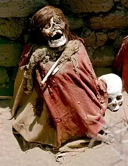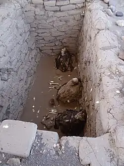 Die Toten wurden sitzend in Baumwollstränge eingewickelt und mit Harz behandelt. Anschließend wurden sie in mit Lehmziegeln ausgekleideten Gruben bestattet. Das extreme aride Klima der peruanischen Küstenwüste ermöglichte die Konservierung der Mumien. Bei den ausgestellten Mumien wurde von den Grabräubern die Baumwollumwicklung im Bereich des Oberkörpers weggerissen, um Zugang zu Kleidung und Schmuck zu erhalten, dabei wurde auch der Kopf mit abgetrennt. Die Köpfe konnten den Körpern oft nicht mehr eindeutig zugeordnet werden. Einige Mumien besitzen aus Baumwolle nachgebildete Köpfe. Es gibt Theorien, nach denen die Köpfe bei einer Opferung abgetrennt und an anderer Stelle verwahrt wurden. Bei der Mumifizierung hätten die Körper zur Vervollständigung Ersatzköpfe bekommen.