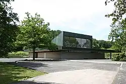 Besondere Aufmerksamkeit verdienen auch die Hochbauten, die sich gekonnt in die Anlage einfügen. Die Friedhofskapelle wurde auf dem höchsten Punkt platziert. Diese spiegelt mit ihren behauenen Betonwänden und der Holzskulptur in der himmelwärts gewandten Glasfront den Stil der 1960er-Jahre wider. Die Aufbahrung ist mit ihren Aufbahrungs-Zellen in rotbraunem Tropenholz und mittelbraunen Wandkacheln würdig und ruhig gestaltet. Im hinteren Teil der Anlage befindet sich der Unterstand, ein grosses Betondach, das auf zwei kleinen Pfosten ruht. Es erinnert in seiner ungewöhnlichen Form an die Bauten von Le Corbusier.