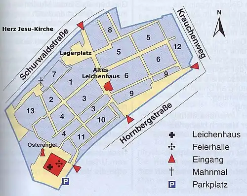 Der Friedhof erstreckt sich zwischen der Schurwaldstraße mit der Herz-Jesu-Kirche im Norden und der Hornbergstraße im Süden und zwischen dem Krauchenweg im Osten und einem Teilstück der Pflasteräckerstraße im Westen. Der größtenteils ebene Friedhof liegt auf einer Höhe von etwa 270 Metern über NN, die Feierhalle liegt auf dem höchsten Punkt des Friedhofs auf einer Höhe von etwa 275 Metern.