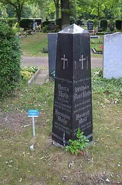 | B/17 | Plewa | 1935 | Stele aus poliertem Diabas. Im Bogenfeld der Treppengiebels befindet sich das Büstenrelief einer Trauernden. | ||