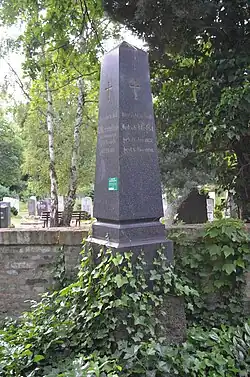 | A/7-9 | Meisenheimer | 1898 | Stele in Formen der Neurenaissance aus poliertem schwarzen Granit mit teilweise erhaltener Einfriedung | ||