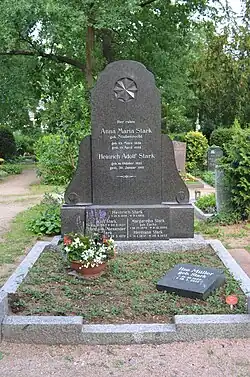 | D/321-322 | Stark | 1919 | Dreiflüglige Stele aus gestocktem schwarzen schwedischen Granit. Die erhabene Schrift und das zentrale, mit dem Relief eine Blumenschale geschmückte Bogenfeld, sind poliert. | ||