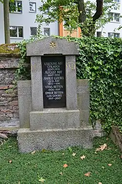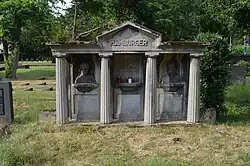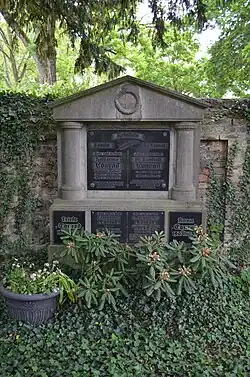 | C/224-225 | Günther | 1914 | Neoklassizistische Ädikula mit einem Schweifgiebel gebrochenen Umrisses tragenden kannelierten Pilastern aus Kalk-Kunststein. Das Schriftfeld besteht aus schwarzem Granit. | ||