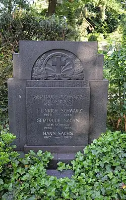 | B/18 | Frank | 1934 | Dreigliedrige Stele aus dunklem Diabas. In der Rundbogennische des erhöhten Mittelteils befindet sich ein Relief des kreuztragenden Christus. Die Seitenteile sind expressionistisch durch Prismen horizontal gegliedert. | ||