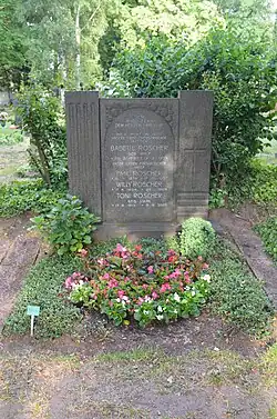 | F/180-181 | Roscher | 1936 | Johann Tempel | Schrifttafel mit rundbogigem Blumenrelief zwischen vertikal durch Kannelur und horizontal durch angedeutete Gesimse strukturierten Eckpfeilern aus poliertem Diabas. | |
