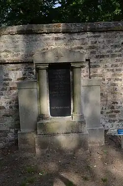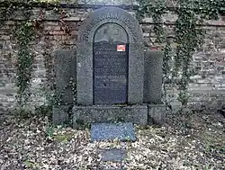 | D/Nordmauer, Grenze zu B | Peter Hafner | 1888 | Grabmal von Peter Hafner (1818–1888), Bürgermeister. Der Grabstein ist eine Schriftstele aus rotem Sandstein in Formen der Renaissance. Die giebelartige Verdachung ist mit floralen Reliefs geschmückt. Darunter befindet sich ein reliefierter Kranz. | ||