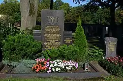 | A/18-19 | Spielmann | 1916 | F. Hofmeister | Ädikulaähnliche Stele aus poliertem schwarzen Granit mit einem geschweiften Giebel. Die Schriftspiegel sind oval und von Kranzreliefs gefasst. |