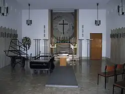 1966 wurde die alte Aufbahrungshalle durch einen Neubau nach Entwürfen von Josef Strelec ersetzt. Der Aufbahrungsraum wurde von Erich Boltenstern gestaltet. Von dem Maler Hermann Bauch stammt ein Mosaik und ein Bleiglasfenster im Eingangsbereich. Das Bronzekruzifix wurde von Viktor Hammer entworfen.