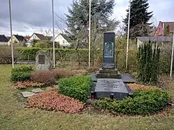 - die um 1920 als schlichte Stele aus Granit markierte Grabstelle der Familie Kaiser