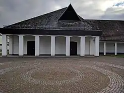 Der neue, 1906 in südlicher Randlage zum modernen Klein-Auheim gelegene Friedhof ist von einer Mauer aus geschichteten Bruchsteinen aus Basalt umfangen und verkörpert damit „eine sowohl traditionelle als auch zweckmäßige Form der Einfriedung.“ Den als Toranlage gestalteten Zugang flankieren zwei eingeschossige, mit Krüppelwalmdächern gedeckte Bauten aus teilweise verputzten Ziegelsteinen. Das eigentliche Tor bilden zwei aus Sandstein geformte Baluster, zwischen denen sich ein lanzettartiger Zaun öffnen lässt.[1]