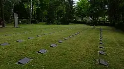 Auf diesem Friedhof befinden sich zwei Kriegsgräberanlagen. Einerseits gibt es ein geschlossenes Feld mit 115 Einzelgräbern, an dessen Ostseite ein Gedenkstein für 81 ausländische Zwangsarbeiter, die noch in den letzten Kriegstagen umkamen und in einem Massengrab beigesetzt wurden,[1] steht. Andererseits gibt es ein Sammelgrab mit 112 Opfern der letzten Kriegstage.[2]