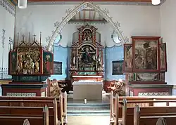 An der äußeren Friedhofsmauer entlang der Mesmerstraße sind Kopien der sieben Kreuzwegtafeln angebracht, die von Hans Müller und Ursula Batin 1657 gestiftet wurden.[2] Die Friedhofskapelle (Liebfrauenkapelle oder Kapelle Beatae Mariae Virginis) befindet sich an der Mesmerstraße/Ecke Kronenstraße. Die Wandmalereien zu Ehren Maria Himmelfahrt sind spätgotisch. Die Kapelle wurde um 1500 erwähnt und war ursprünglich als Siechenkapelle vor den Toren der Stadt für die Pestkranken und Siechen des Siechenhauses eingerichtet. Sie wurde 1682 nach der Verlegung des Friedhofs von der Pfarrkirche vor die Tore der Stadt zur Friedhofskapelle.[3]