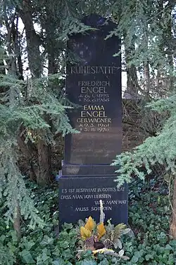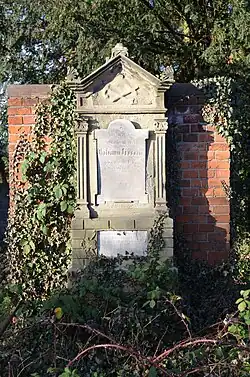 | Ziegler | 1919 | Neoklassizistische in Flügelmauern auslaufende mittig durch vorgesetzte Blumenkästen betonte Ädikula aus gestocktem Granit, die Schrifttafel poliert, im Rundgiebel das Relief eines Rosenbuketts | |