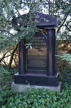 | Wagner | 1922 | Pfeilerädikula aus poliertem schwarzen Granit; eingelassen ein Relief mit dem Orpheusmotiv aus Galvanobronze, Steinmetz J. Rumpf | |