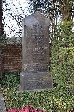 | Wagner | 1902 | Ädikula aus poliertem schwarzen Granit mit eingravierten floralen Ornamenten, Steinmetz Hofmeister | |