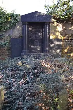 | März | 1915 | Neoklassizistische Stele in Form einer Ädikula aus gestocktem Granit mit polierter Schrifttafel, Steinmetz vermutlich J. Rumpf | |