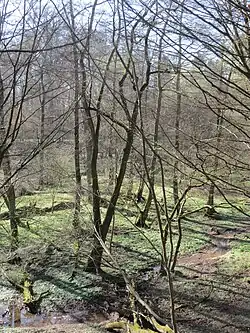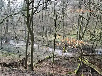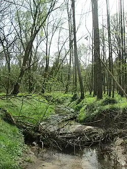 Am Unterlauf des Baches wachsen Erlenwälder mit Schwarzerlen, Eschen, Silberweiden und Bastardpappel und unten in der Krautschicht gedeihen die Brennnessel, der Schilfröhricht, das Zittergras, die Rasenschmiele, das Pfaffenhütchen, der Nelkenwurz und das Klettenlabkraut.[2]
