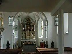 Die im Kern spätgotische Saalkirche wurde im 1. Viertel des 16. Jahrhunderts erneuert. Unter Roman Giel von Gielsberg wurde sie 1673 erweitert und umgestaltet. Sie besteht aus einem Langhaus mit einem dreiseitig geschlossenen Chor im Osten und einem romanischen Kirchturm an der Südostecke des Langhauses, dessen oberstes Geschoss den Glockenstuhl beherbergt, in dem eine Kirchenglocke hängt, und der quer mit einem Satteldach bedeckt ist. Der Innenraum des Langhauses ist mit einer Flachdecke überspannt, der des Chors mit einem Stichkappengewölbe. Die Fresken von 1673 wurden weitgehend erneuert. Im Chor befindet sich eine Monstranz.
