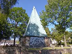 1954 übernahm der Volksbund Deutsche Kriegsgräberfürsorge den Ausbau und die Gestaltung des alten Friedhofs um den Kirchturm zur Kriegsgräberstätte, auf der 422 Kriegstote bestattet wurden. Der Turm innerhalb des Gräberfeldes wurde Ehrenmal und in seinem Untergeschoss eine Gedenkkapelle eingerichtet. Nach Beginn von Instandsetzungsarbeiten stürzte der Turm am 5. Oktober 1968 ein. Durch den Kölner Architekten Günter Hagen wurde auf dem Grundriss des alten Turmes unter Einbeziehung erhaltener romanischer Mauerteile eine neue Kapelle mit repräsentativer kupferbedeckter Pyramide als Bekrönung errichtet.[1][2]