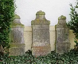 Die Gedenksteine an der Nordfassade sind der verwitweten Mehlhändlerin („Melberin“) Maria Helena Prandtner und deren beiden Töchtern Helena (* 1780) und Johanna (* 1787) gewidmet. Der mittlere, etwas höhere Grabstein trägt die Überschrift „Zum Ewigen Andenken“; alle drei Steine sind mit Gedichten beschriftet und tragen auf dem Sockel die Lebensdaten der Bestatteten, die jeweils mit den Worten „Ermordet den 17. März 1800“ enden. Auf Helena Prandtners Grabstein wird auf die näheren Umstände der Bluttat eingegangen: Die Mörder hätten weder Blut noch Jugend noch „andere schöne Tugend“ geschont, „Obwohls im Hause wohnten“, sie stünden allerdings auch bereits vor dem ewigen Richter. Das Gedicht auf dem mittleren Grabstein, der der Mutter gewidmet ist, ergänzt diese Informationen um die Tatzeit: Die drei Mordopfer seien „in schwarzer Nacht“ getötet worden. Das Gedicht auf dem Grabstein für die jüngere Tochter stellt vor allem das jugendliche Alter der Johanna Prandtner in den Vordergrund. Es beginnt mit den Versen