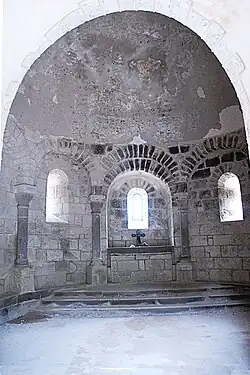 Die innere Ausschmückung mit Blendarkaden und skulptierten Säulenkapitellen deutet hingegen auf eine frühere Ausführung hin (10. Jahrhundert oder früher). Man könnte sich den älteren Bau in Form eines reinen zylindrischen Baukörpers vorstellen, ohne schmückende äußere Strukturen, mit einem schlichten kegelförmigen Dach überdeckt, und mit einigen schlitzartigen Fensteröffnungen, einem schlichten Portal und statt einer Chorapsis einer rechteckigen Wandvorlage.