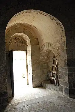 Die Wände der kreisförmigen Rotunde werden von sieben Blendarkaden gegliedert, zuzüglich eines etwas verzerrten Bogens des Narthex-Tonnengewölbes. Die Arkadenbögen werden aus Keilsteinbögen mit rechtwinkligen Kanten gebildet, die auf Säulen stehen, die mit skulptierten Kapitellen, profilierten Kämpferplatten mit abgeschrägten, teils gekehlten Unterkanten, zweifach profilierten Basen und kantigen Plinthen mit Abschrägung der Oberkanten, ausgestattet sind. Die Plinthen stehen auf würfelförmigen Konsolen in Höhe einer Mauerschicht, diese wiederum auf einem nicht vollständig umlaufenden Sockel. Die Hintergründe der Blendarkaden laufen hinter den kreisrunden Säulenschäften durch. Die Zwickel zwischen den Oberseiten der Keilsteine bis zur Höhe der Keilsteinscheitel sind mit Mauerwerk oberflächenbündig ausgefüllt.