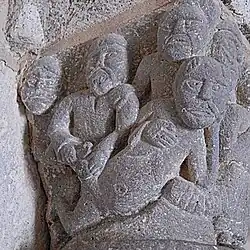 Auf der linken Kapitellseite liegt ein offensichtlich Unbekleideter (mit sichtbarem Bauchnabel) mit der linken Körperseite auf einem dekorativen Kissen und stützt darauf seinen Kopf mit dem linken Arm ab, erkennbar als eine Person mit Ansehen. In seiner Hüftgegend ist ein Anderer mit einer rätselhaften Angelegenheit beschäftigt. In den Quellen reichen die Deutungen dieser Szene von der Beschneidung Abrahams[1][4], der Peinigung eines Heiligen[4], einer heidnischen Kastration[4] bis hin zu einer medizinischen Behandlung jener Zeit[4].