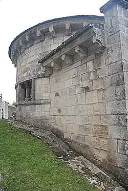 Auf der Ostseite der Rotunde ist eine größere Wandvorlage angeordnet, die es erlaubte, im Innern eine tiefere Wandnische zu installieren, die einen kleinen Altar aufnehmen konnte. Diese Vorlage besitzt außenseitig eine plane Oberfläche und ist oberseitig durch eine dachartige Abschrägung abgedeckt, die ein Stück unter dem Traufgesims abschließt. Inmitten der Wandvorlage ist ein schlankes rundbogiges Fenster ausgespart, das von oberflächenbündigen Keilsteinen überdeckt ist. Die oben genannten beiden Kraggesimse stoßen gegen die Seitenflächen der Vorlage. Auf der Vorlage selbst verläuft ein waagerechtes Kraggesims mit unterseitiger Abschrägung knapp unter der Höhe des oberen Gesimses und wird auf den Seitenflächen der Wandvorlage herumgeführt. Dieses Gesims umschließt halbkreisförmig die Keilsteine des Fensters.