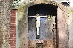 Auf dem Friedhof steht ein Wegekreuz in einer Mauernische der Friedhofsmauer. Die Kreuzwegstationen sind in Nischen in der nördlichen Friedhofsmauer. Sie bestehen aus Reliefplatten aus gebranntem Ton, die glasiert und bemalt sind. Das Ensemble wurde um 1900 geschaffen.