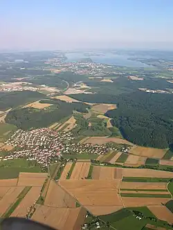 Der Egelsee ist ein stark verlandetes Toteisloch, das noch einige offene Tümpel aufweist. Der Litzelsee hat sich zu früheren Zeiten nach Starkregen oder Schneeschmelze mit Wasser gefüllt. Zwei Fischweiher von beachtlicher Größe, wie sie auch heute noch in Oberschwaben anzutreffen sind, wurden abgelassen und werden durch den Krautländergraben und den Rebmannsweihergraben durchflossen und entwässert. Von diesen Fischenzen, die einst zur Burg gehörten, sind die Weiherdämme noch vorhanden. Gleichzeitig entsteht durch Kiesabbau seit 2009 im Südosten der Gemarkung ein neuer See, der Friedinger See, der einmal der zweitgrößte im Landkreis und der viertgrößte in Baden-Württemberg sein wird. Der größte Schwimmbagger in Deutschland sorgt in Phase 1 (bis 31. Dezember 2024) für eine Tiefe 60 m und eine Fläche von 20,6 ha.[5] Im Endausbau soll dieser See einmal 112 ha groß werden.[6]