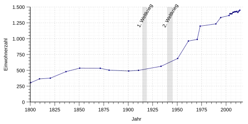 | Einwohner | 306[19] | 366[20] | 377[21] | 480 | 535 | 533 | 503 | 490 | 500 | 564 | 687 | 963 | 989 | 1198 | 1233 | 1333 |