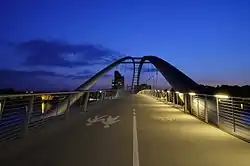 Zu Fuß oder mit dem Rad erreicht man Huningue über die 2007 neu errichtete Dreiländerbrücke, die weltweit längste Bogenbrücke ihrer Art. Die markante Linienführung der mit vielen Architektur- und Ingenieurpreisen ausgezeichneten Brücke ist mittlerweile zum Symbol für die gesamte Stadt Weil am Rhein geworden. Das Stadtmarketing von Weil am Rhein verwendet die Silhouette der zu Abendstunden auch angestrahlten Brücke für ihr Erkennungslogo.
